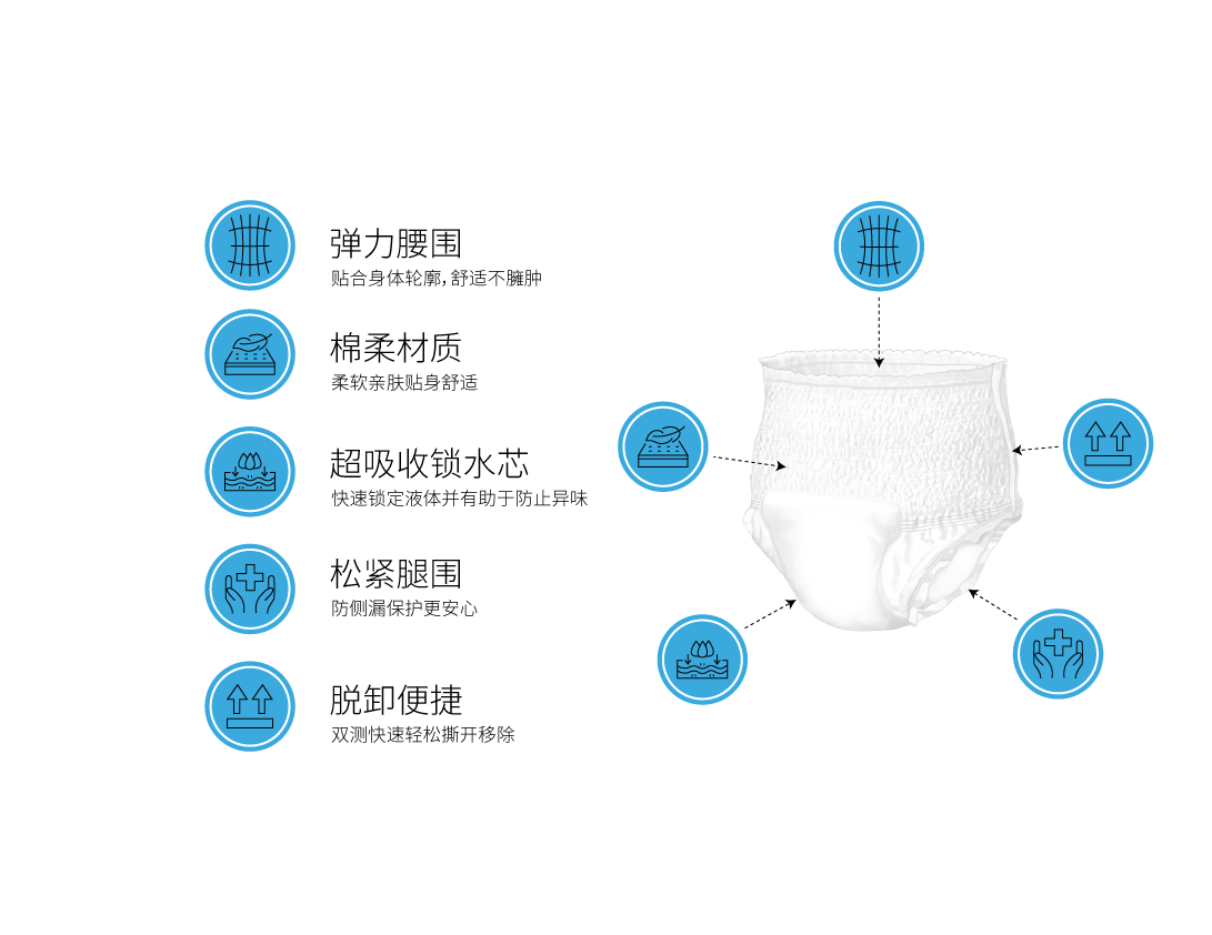 超吸收锁水芯:能快速锁定液体,还能辅助减少异味,保持干爽状态;