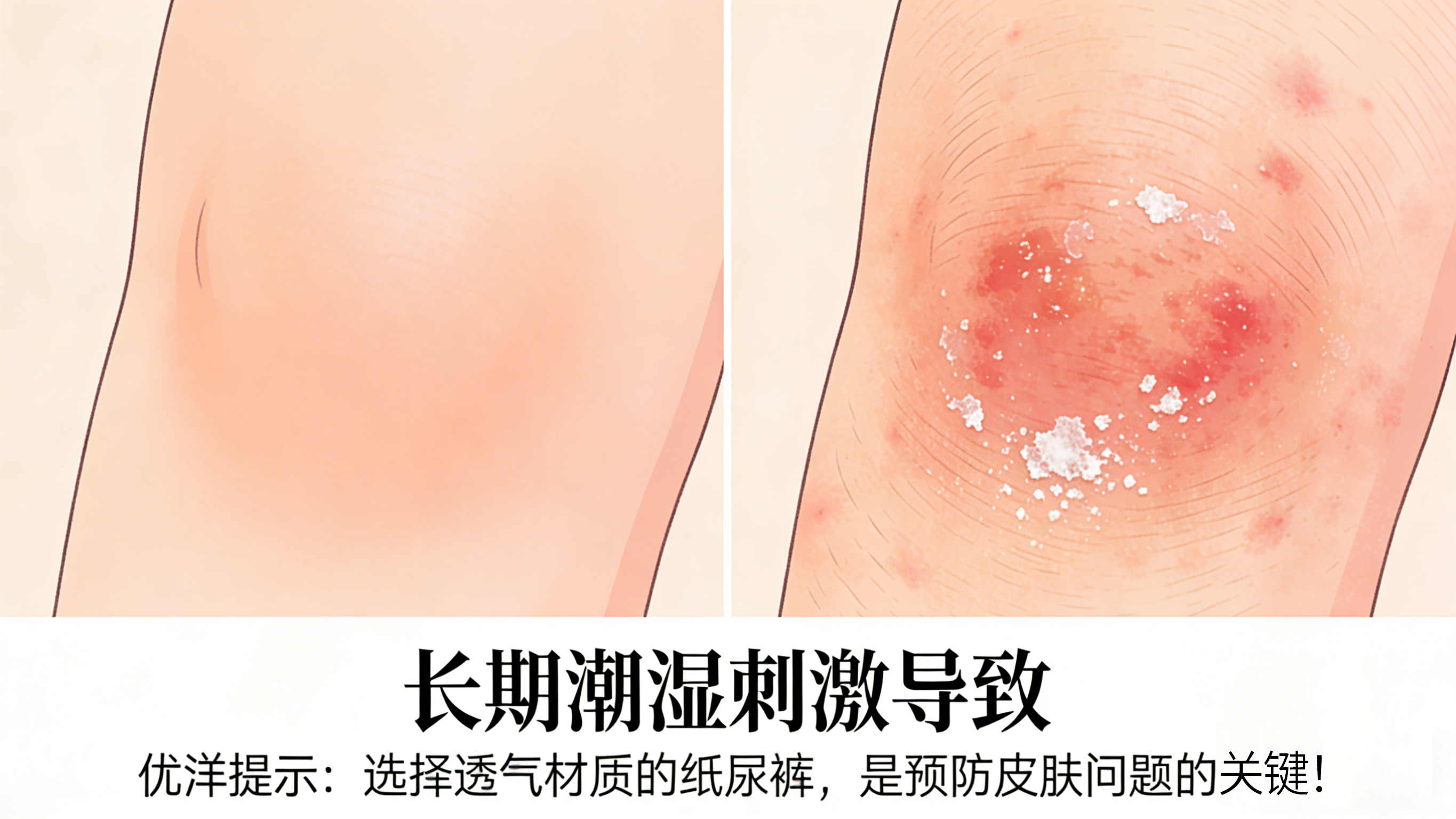长期穿戴不透气的纸尿裤,皮肤会持续处于潮湿状态,尿液中的氨、尿酸等物质会刺激皮肤角质层,引发泛红、瘙痒,严重时还会导致湿疹、压疮。尤其老年人皮肤新陈代谢减慢,屏障功能减弱,中招概率更高。
